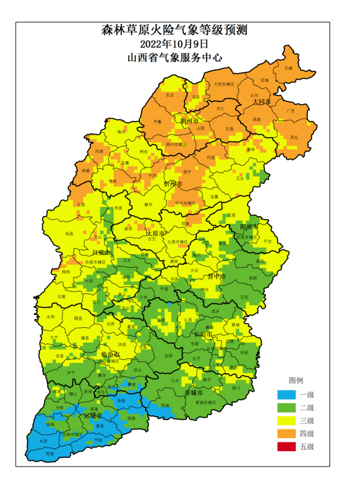 山西省 2022年10月9日森林草原火险气象等级预测图